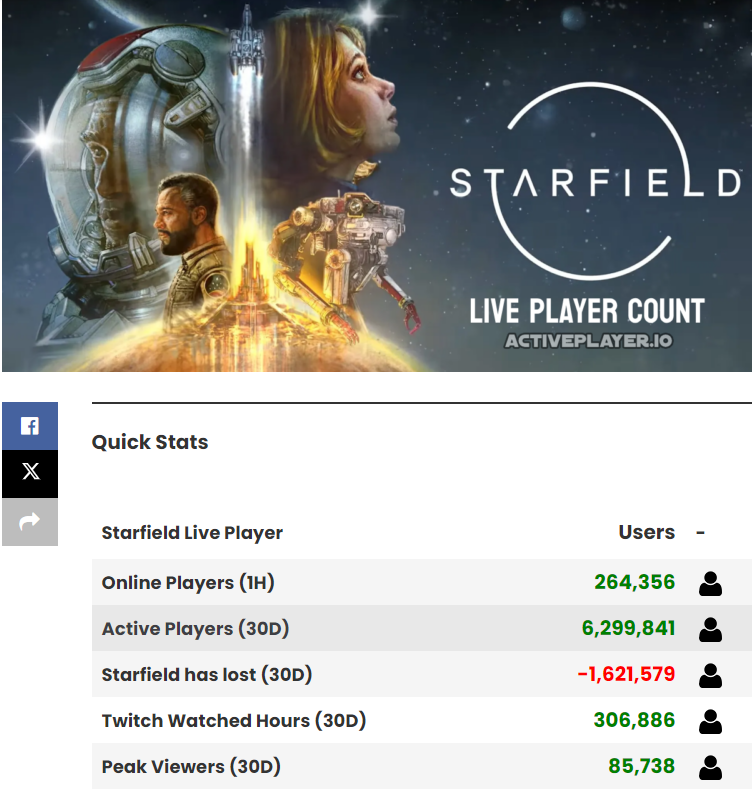 Meskipun Bethesda telah sukses secara historis dengan game-game seperti Fallout dan Skyrim, Starfield nyatanya kesulitan mempertahankan basis pemainnya. Dalam waktu kurang dari enam bulan, Starfield mengalami penurunan signifikan, kehilangan lebih dari 94% pemainnya di Steam.