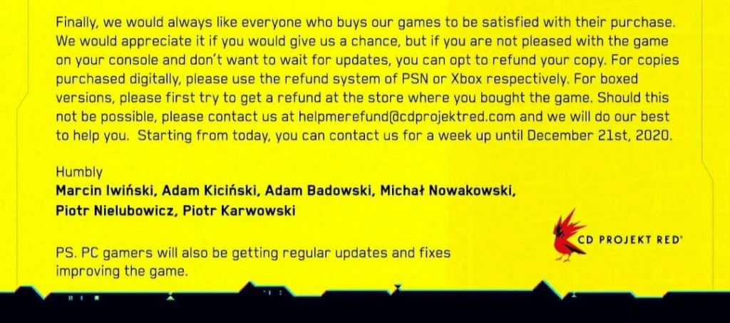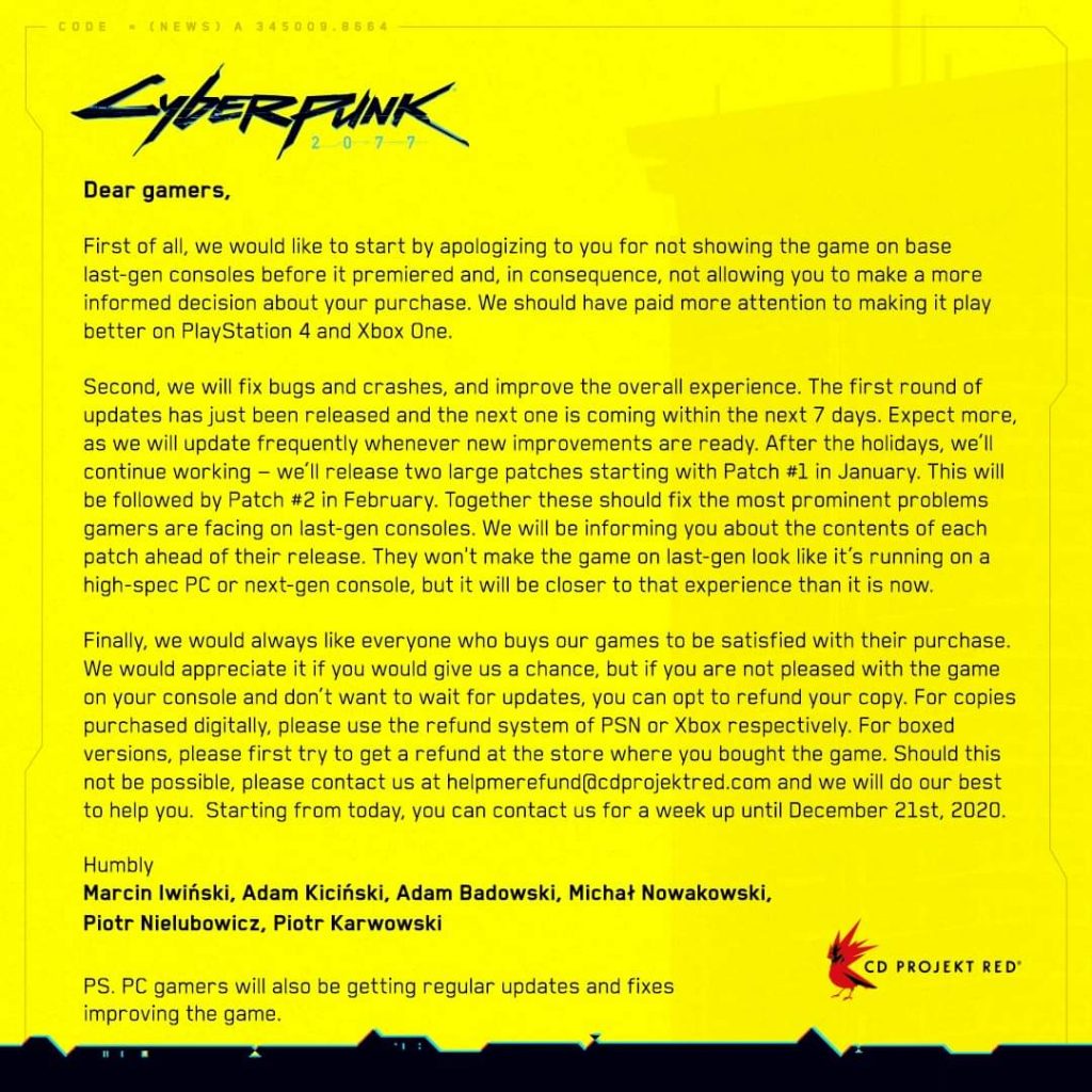 Dan benar, hanya empat hari berselang, dari segala gempuran dan komplen yang diterima, CD Projekt Red mengeluarkan statement resmi untuk menerima refund dari game Cyberpunk dari berbagai platform. Digital maupun fisik. Dari PS Store, Steam, EGS, sampai GOG yang menjadi portal jualan game CD Projekt Red sendiri.