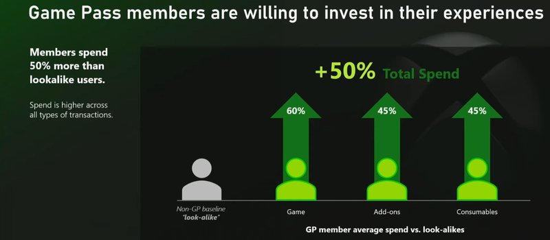 Contoh, ketika orang langganan Gamepass dan nyoba main Dragon Quest Builder 2, tau-tau nggak kerasa ratusan jam mainin itu, dia akan tertarik untuk beli konten tambahan/add-ons/DLC. Kalo DLC game tersebut udah dibeli, dia bisa mencari lagi game dengan genre sim builder sejenis atau yang mendekati. Pas diliat di list Gamepass, eh taunya nggak gratis. Akhirnya dia beli. Makin di-eksplore, makin suka. Akhirnya dia melebarkan spending-nya untuk game yang bahkan nggak ada di Xbox untuk bisa mainin game builder lainnya. Long story short, bermula dari langganan Gamepass, dia jadi beli game-game yang dijual di luar list Gamepass, sampai akhirnya jadi gamer yang multiplatform.