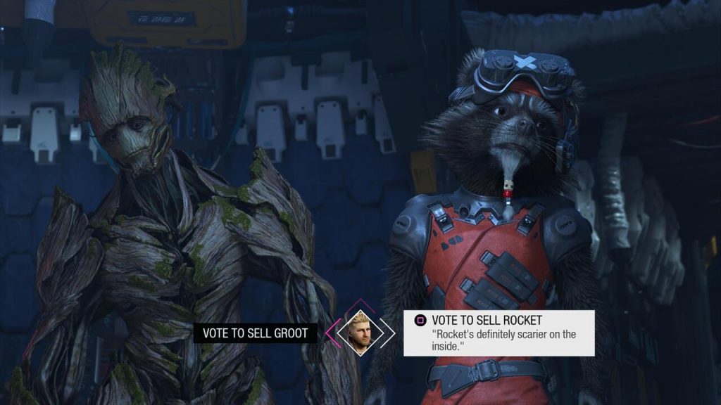 Opsi pengambilan keputusan yang dilakukan Starlord pun demikian. Mungkin dari beberapa pilihan, hanya ada satu atau dua yang memberikan efek paling signifikan. Misalnya kalau Starlord memilih untuk playing nice dengan Nova Corps, di chapter selanjutnya akan dimudahkan karena kita dikasih akses masuk ke markasnya. Endingnya tetap akan sama walau progress masing-masing player bisa berbeda. Misal, player A akan menemui musuh lebih banyak daripada player B karena player A selalu mengambil opsi not playing nice. Atau di suatu chapter, player A nggak bermain dengan Rocket karena kita milih untuk “bermusuhan” dengan Rocket.