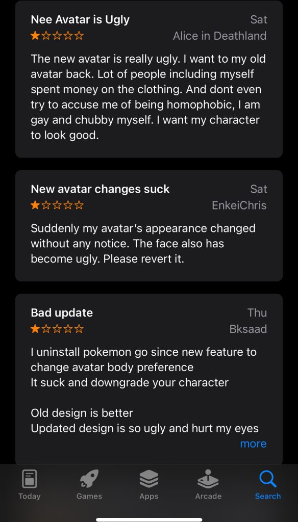 Meskipun niatnya baik, banyak pemain yang merasa kecewa dengan tampilan baru karakter dalam permainan mereka. Apa yang diharapkan sebagai inovasi, malah menjadi sumber frustrasi dan kekecewaan bagi segmen vokal dari komunitas Pokemon GO. Yang lebih parahnya, pemain tuh nggak bisa menggunakan tampilan karakter lamanya. Pokemon GO memaksa pemain menerima tampilan karakter tersebut tanpa memberikan opsi apapun.