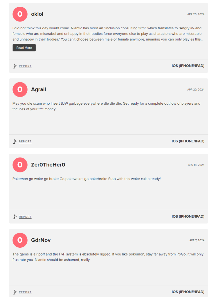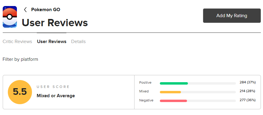 Ketidakpuasan di antara pemain Pokemon GO telah termanifestasi di berbagai platform, mulai dari media sosial hingga tempat mendownload aplikasi Pokemon GO. Para penyedia aplikasi dipenuhi dengan ulasan bintang 1, sementara halaman Metacritic permainan ini dipenuhi dengan skor 0/10, menjadi bukti dari besarnya komplen dan ketidakpuasan.