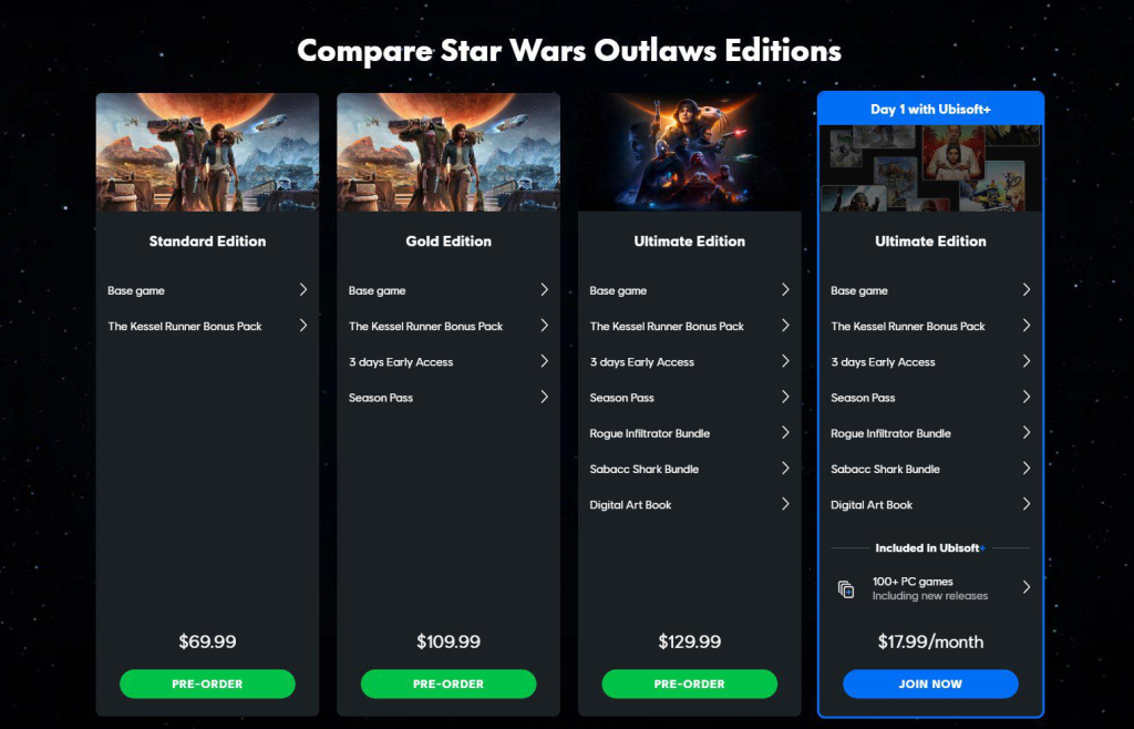 Strategi pricing untuk harga game Star Wars Outlaws nampaknya emang bikin netijen meradang. Gampang aja, seri Ultimate Edition dibanderol $129.99 (setara dua juta rupiah kurang dikit), atau hampir dua kali lipat dari harga base game yakni $69.99 . Daripada kita ceng-cengin pasukan mendang-mending dengan template, “Pasarnya bukan buat elu kali“, lebih bijak tentunya jika kita terlebih dahulu mempertanyakan apa isi dari Ultimate Edition tersebut. Meskipun termasuk Season Pass yang menawarkan dua DLC, tambahan keuntungan seperti main 3 hari duluan untuk feeding FOMO, item kosmetik, dan misi tambahan khusus para gamer yang pre-order.