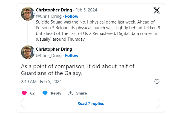 Uniknya, penjualan Suicide Squad ini paling bagus di platform PS5. Sempet menduduki peringkat nomer 1 di UK chart untuk versi fisik, walau emang cuma setengah dari penjualan fisiknya Guardian of The Galaxy.